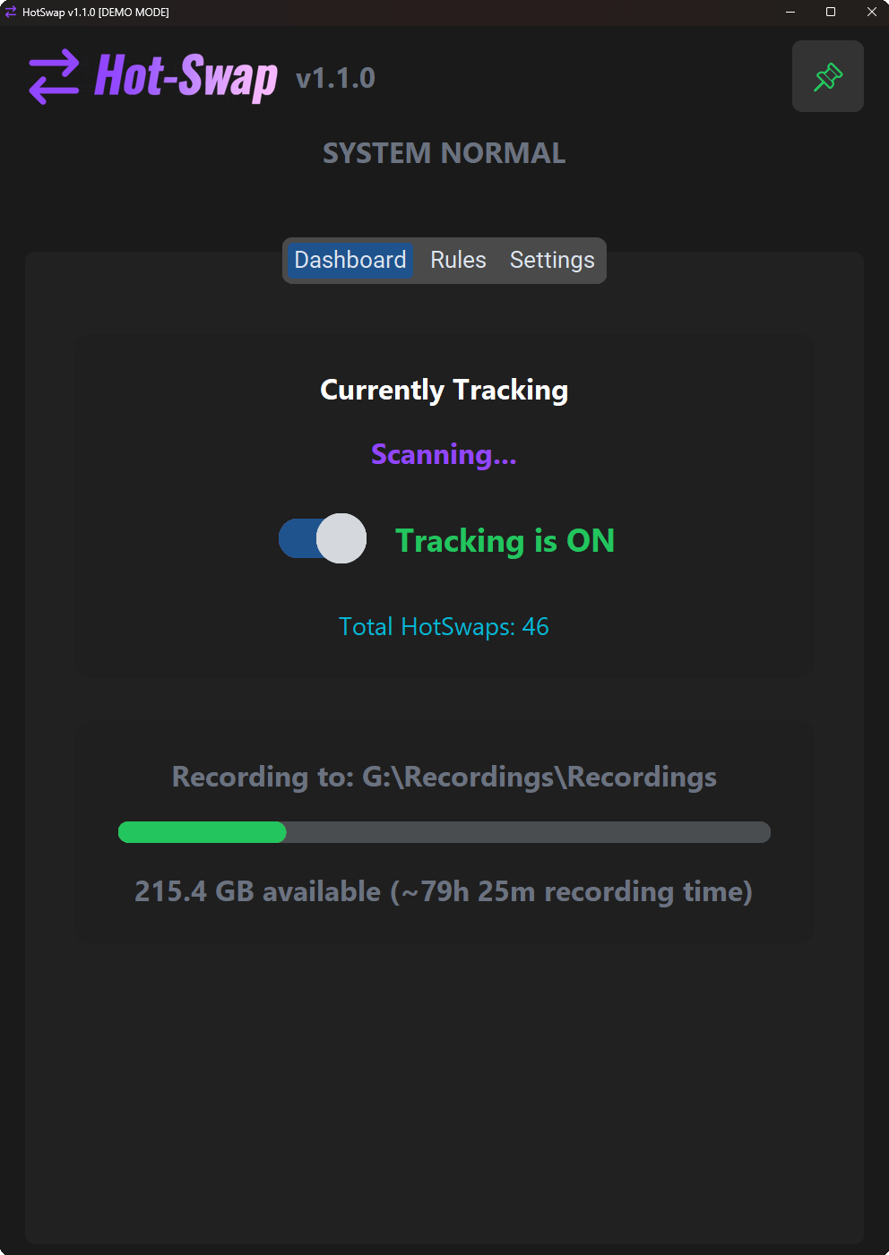 But it's not just about switching — HotSwap keeps an eye on performance too. It'll alert you with on-screen overlays if OBS starts dropping frames (maybe your bitrate's too high or CPU's overloaded), or if a game's aspect ratio doesn't match your canvas (hello, ultrawide mismatches). You get customizable audio cues for detections and switches, hotkeys for everything, and even a storage monitor that estimates how much recording time you have left on your drive.