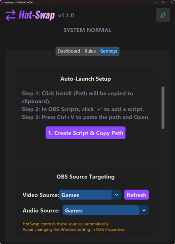 Why does OBS flicker when switching games? HotSwap briefly disables and re-enables the capture source when switching games. This forces OBS to strictly "un-hook" the old game and "re-hook" the new one. Without this, OBS can sometimes freeze or take 10+ seconds to switch. The flicker is a necessary speed optimization.