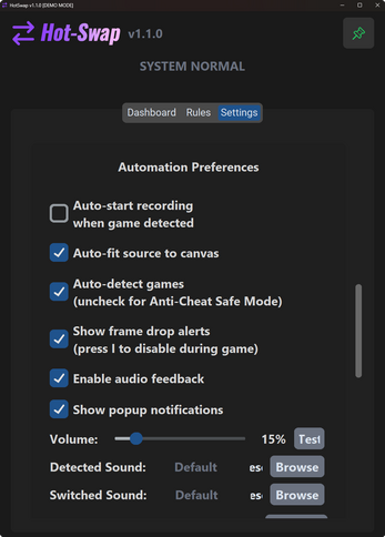 For competitive gamers, there's Anti-Cheat Safe Mode to turn off auto-detection entirely — just add games manually via a quick scan of running apps. And if you juggle OBS scene collections, HotSwap remembers your source picks for each one. No more re-configuring after switching profiles.