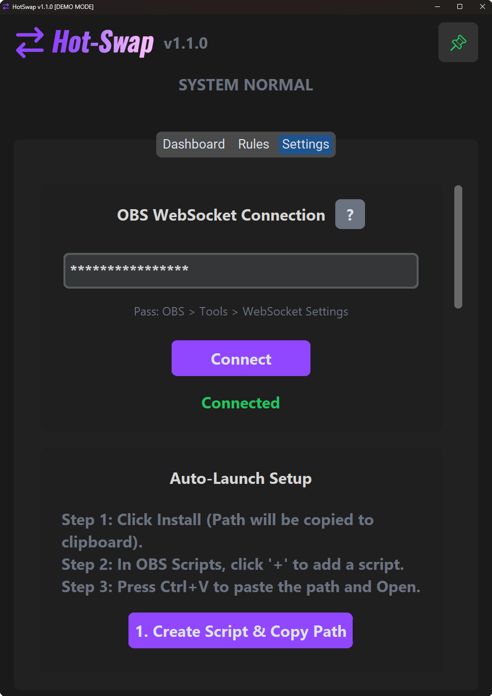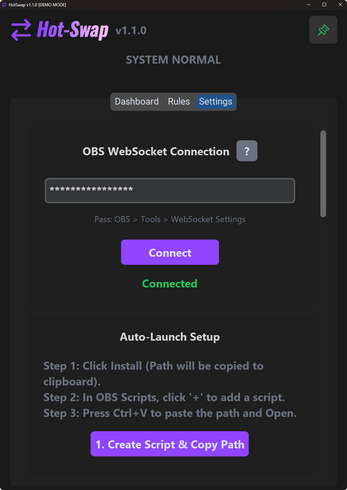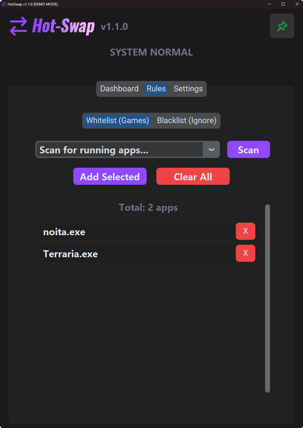 Here's how it works in depth: HotSwap runs quietly in the background, connected to your OBS via its built-in WebSocket server. It monitors your active window and detects when you're playing a game based on real keyboard activity (like holding WASD or other customizable keys). If it's a new game not on your whitelist, it pops up an on-screen overlay and a suggestion in the app's dashboard — complete with audio feedback so you know even if you're fullscreened. Just hit F9 (or your custom hotkey) while in-game, andHotSwap adds it to your whitelist instantly.