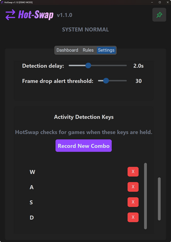 Will I get banned in competitive games? HotSwap is designed to be safe. It never injects code into games, never simulates input, and never reads game memory. It simply checks if you are holding down movement keys (using standard Windows APIs) to know you are gaming. Still worried? Enable "Anti-Cheat Safe Mode" in Settings. This turns off auto-detection entirely; you can still add games manually via the list.